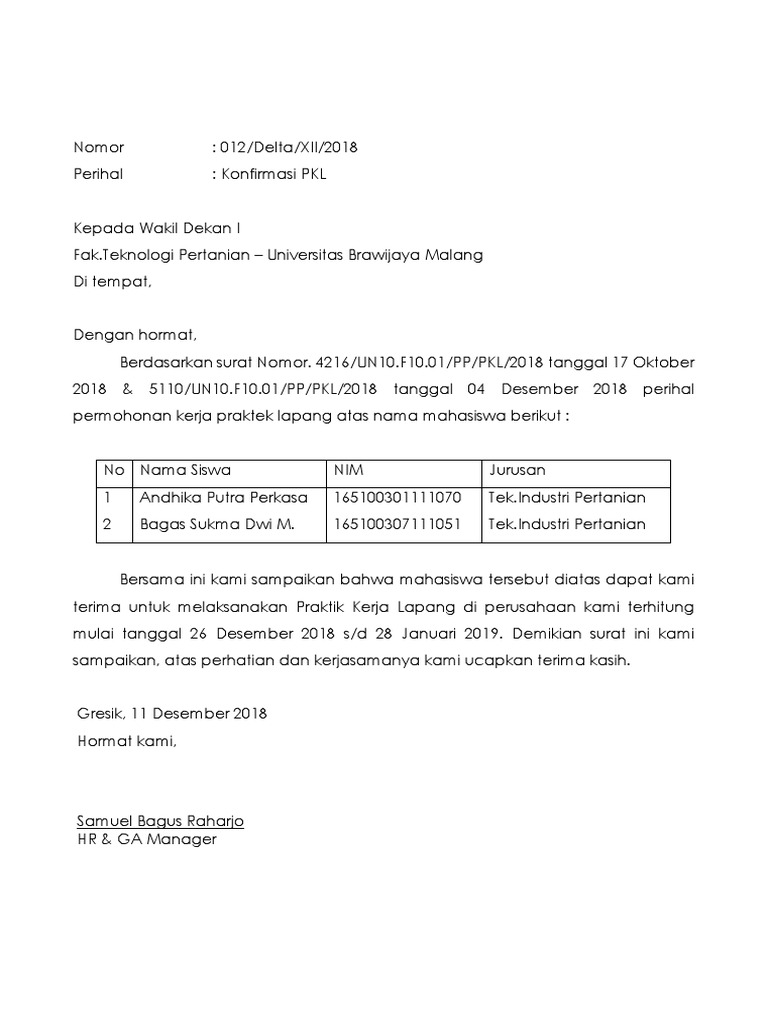 Praktik kerja lapangan atau yang sering disebut dengan pkl adalah salah satu program pendidikan sekolah yang banyak ditemui di sekolah kejuruan maupun pada tingkat perguruan tinggi. Balasan surat permohonan praktek kerja lapangan kepada menindaklanjutin surat permohonan praktek kerja lapangan, dengan surat ini kami bersedia. Balasan selaras dengan amal perbuatan surat balasan magang. Kewirausahaan dalam perspektif hadis skripsi.balasan kepadanya dengan balasan yang paling sempurna Dengan hormat, sehubungan dengan adanya program praktek kerja lapangan (pkl).
